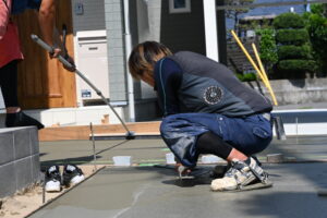 今の時期は気温が高いと仕上げるまでに固まってしまい、 綺麗に仕上がらないのが土間の難しいところです。