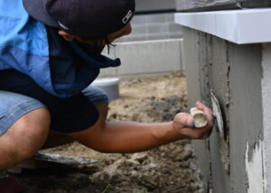 事務の堀です。今回は洗い出しの作業の様子についてご紹介します。洗い出しとはモルタルの中に砂利を混ぜ、その表面を洗い出すことによって砂利や砂の表面を浮き出させる仕上げです。こちらの砂利は【南部砂利】を使